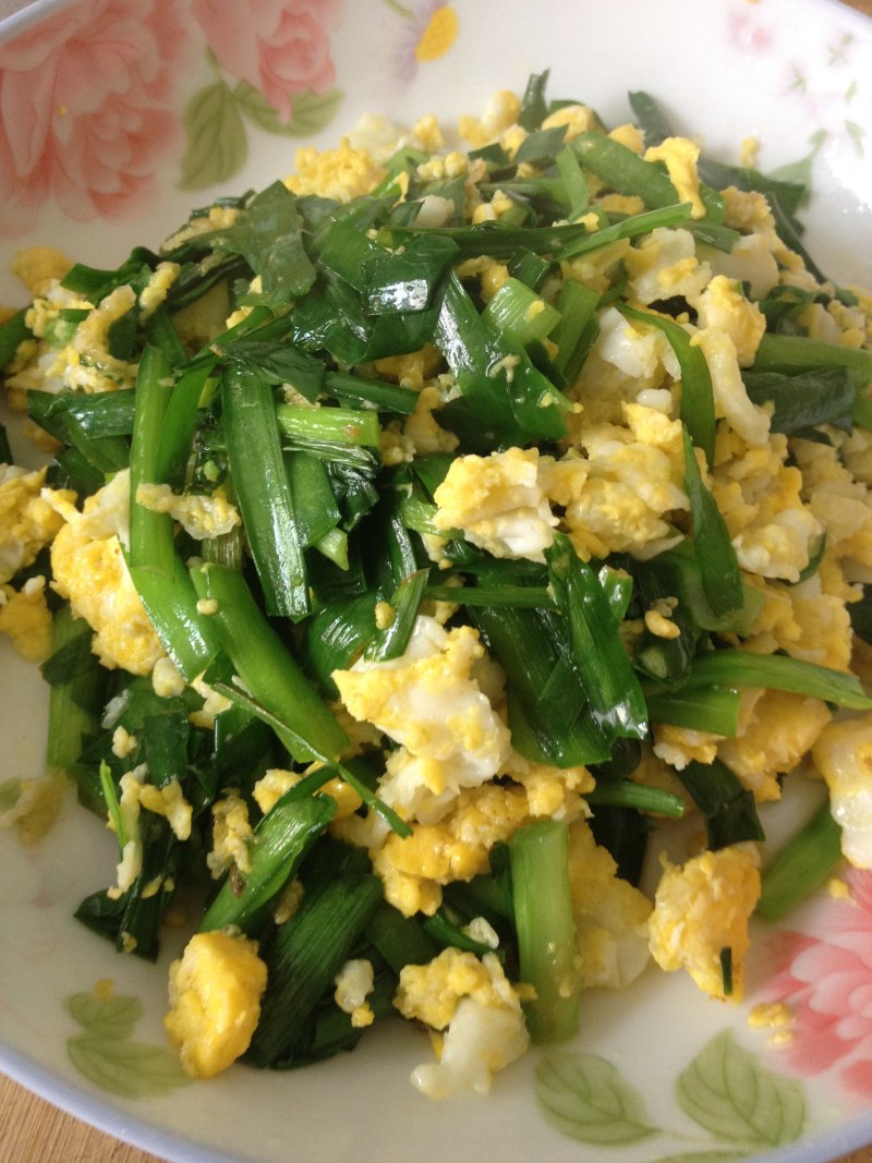 3:锅里加点油,大火炒韭菜几秒,加入鸡蛋,翻炒均匀。