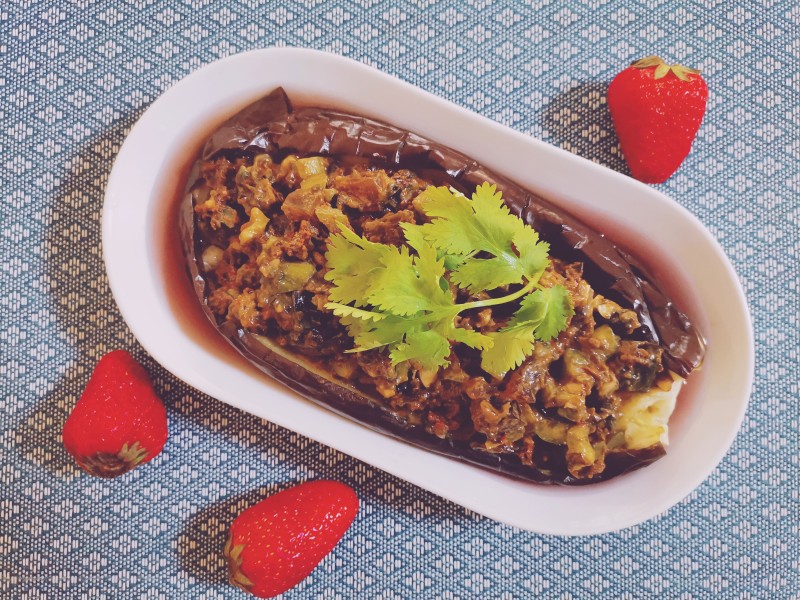 4:蒸好的茄子切开填入拌料即可,不赶时间的话,放在冰箱里冷藏几个小时风味更佳。