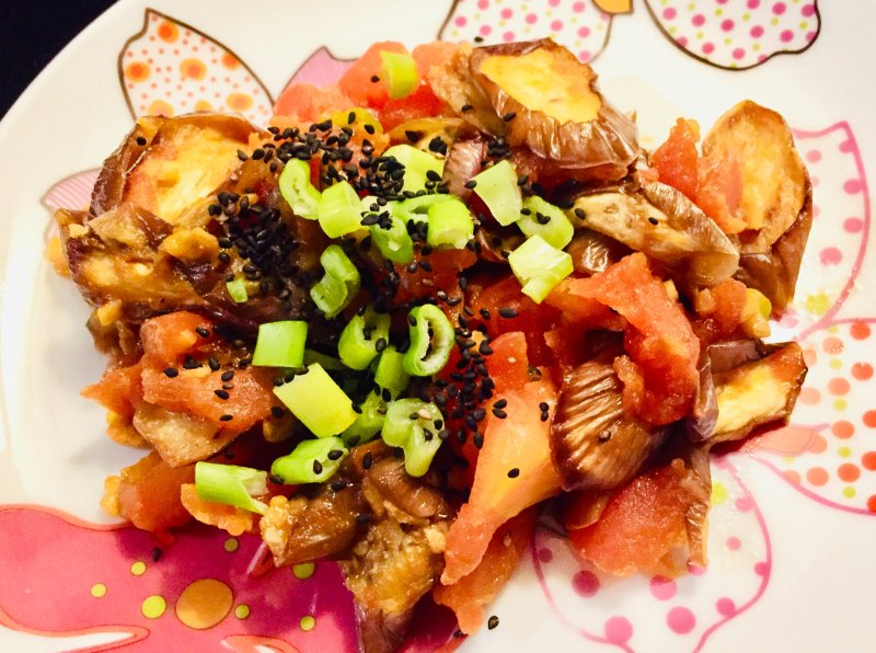 细茄子3个;西红柿200g;葱(绿的部分)1颗;姜一小块;味噌酱1勺;芝麻2勺;生抽1勺;白糖10g;