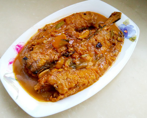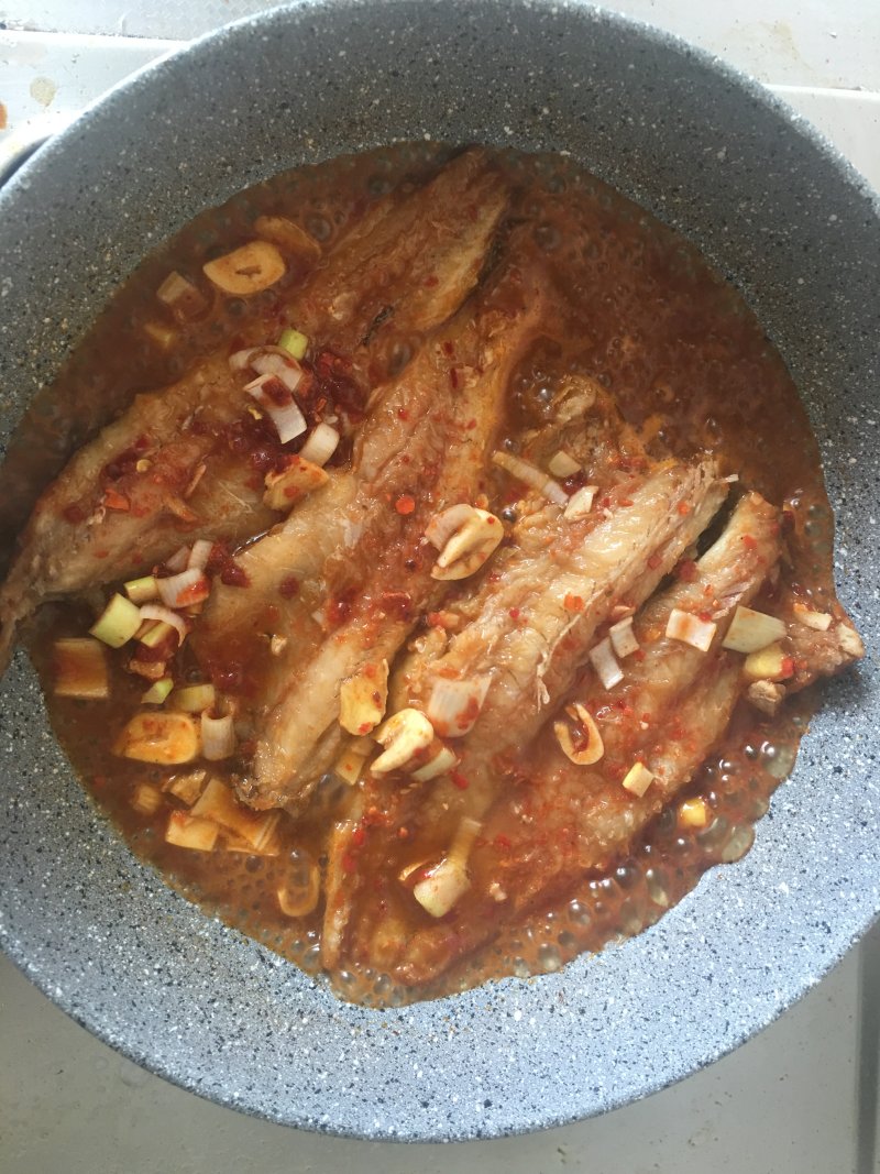 10:中火收至汤汁粘稠,汤汁渐少时,可以把铲子放在鱼下,避免粘锅汤汁收到这样就差不多了,汤汁太少的鱼吃起来干干的。关火加入少量麻油。静置5分钟再起锅,这样汤汁就能充分的渗入鱼肉中。