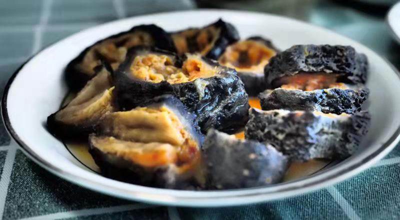 3:将海参用浓茶汤炆软,以蔬菜伴食即成。