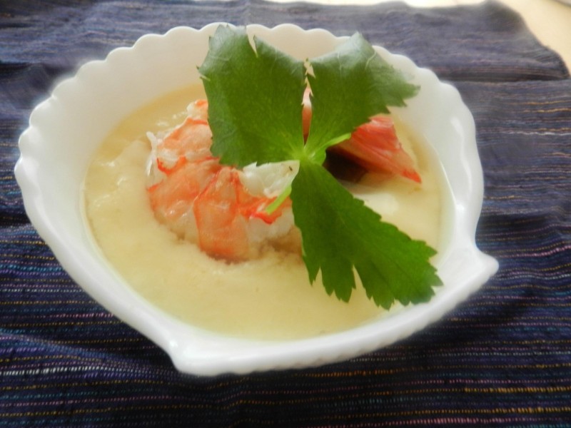 ②其他的食材像银杏,百合根,鱼是很适合摆入茶碗蒸的材料。⑤慢慢倒入蛋汁的时候小心不要打出泡沫。⑥因为比较重的食材会沈到碗底,所以如果想要让它浮在蒸蛋的上层,就先不要放入蛋液中,等蒸到一半时,放进去就可以了。⑥最后将三叶放在上面。