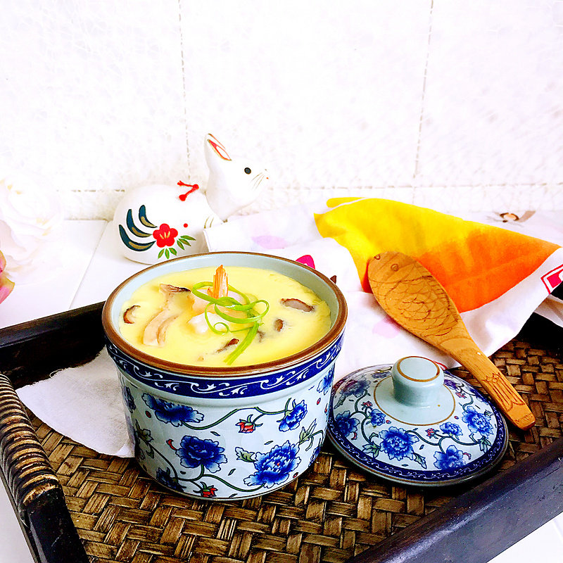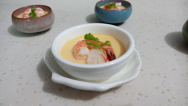 12:在蒸到上面蛋液凝固后,放入虾仁、海参等装饰一下,再一起蒸一下即可,食用的时候可以淋上生抽、香油