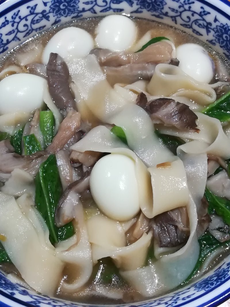 1:平菇焯水撕片,葱切碎,鹌鹑蛋煮熟剥皮。