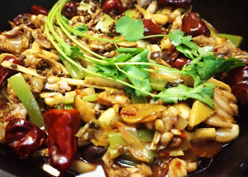10:另起锅倒油,放入麻椒,小火爆香。油锅热后倒入盛好的牛蛙上炸出香气即可。