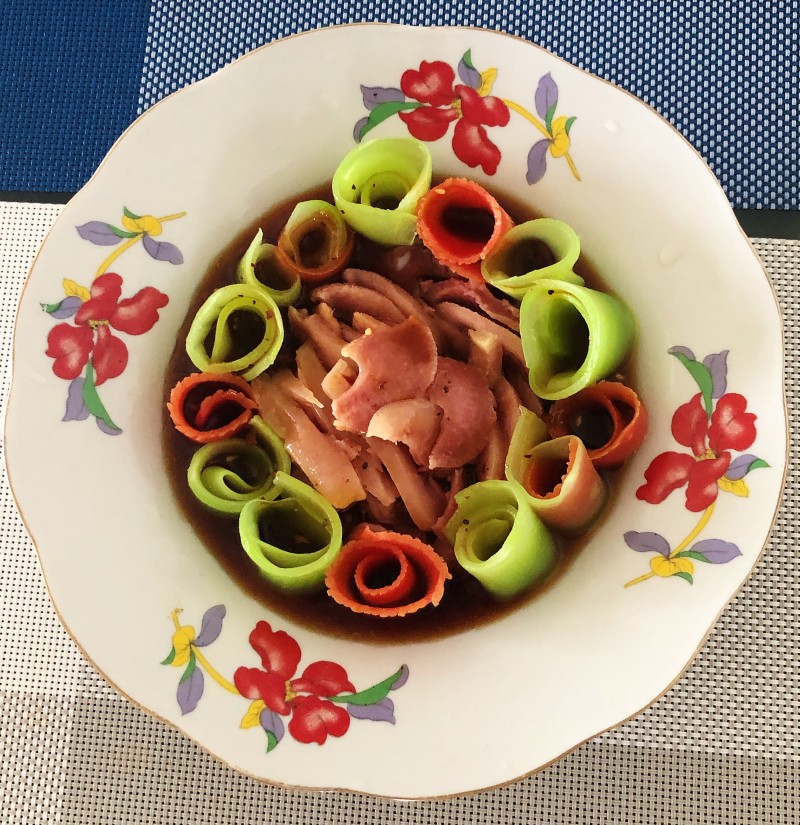 3:猪葱嘴煮熟后,摆入盘中中间,莴笋片和胡萝卜片裹成圆筒状摆在四周。