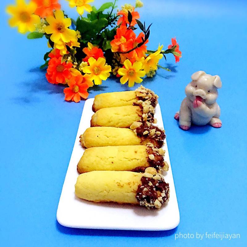 10:把巧克力放在微波炉中溶化、把烤好的饼干头裹一层巧克力、再沾上花生碎即可、(如果您喜欢花生碎、可以到我的菜谱里搜到做法!)吃着又香又酥脆!根本停不下来!