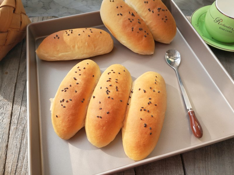 15:小面团发酵至1.5倍大时,取出用喷壶喷上一层水,撒上黑芝麻即可,如果不想要表面的装饰,可以直接进预热好的烤箱了。烤箱预热上火170下火165,预热完成将烤盘放入烤箱,烤制13分钟,面包表面金黄色即可出炉,晾凉后就可以食用啦。