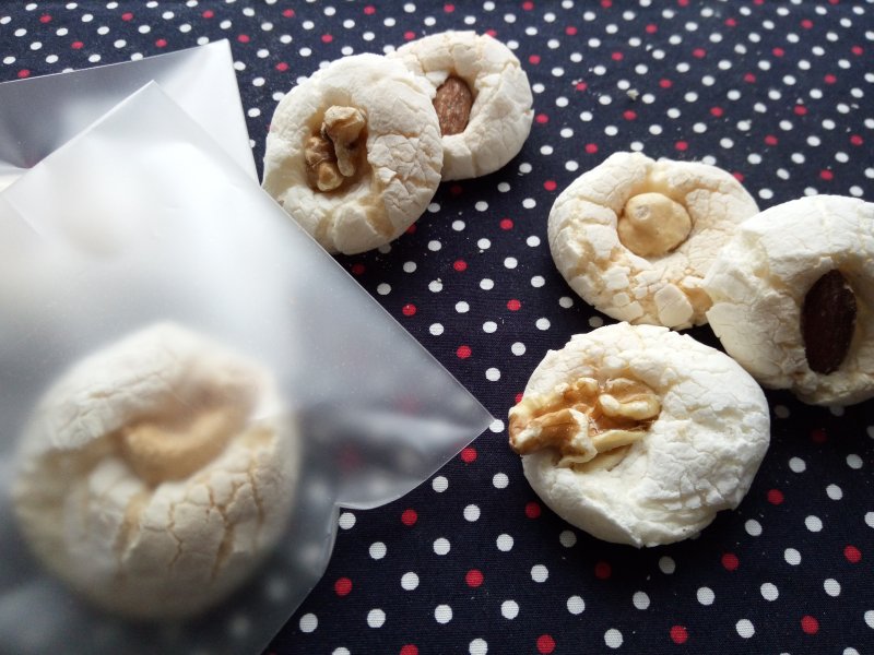 4:讲烤盘放进预热好的烤箱中,120℃烤10分钟、再调降温度到100℃烤20~30分钟,至棉花糖变得干脆。