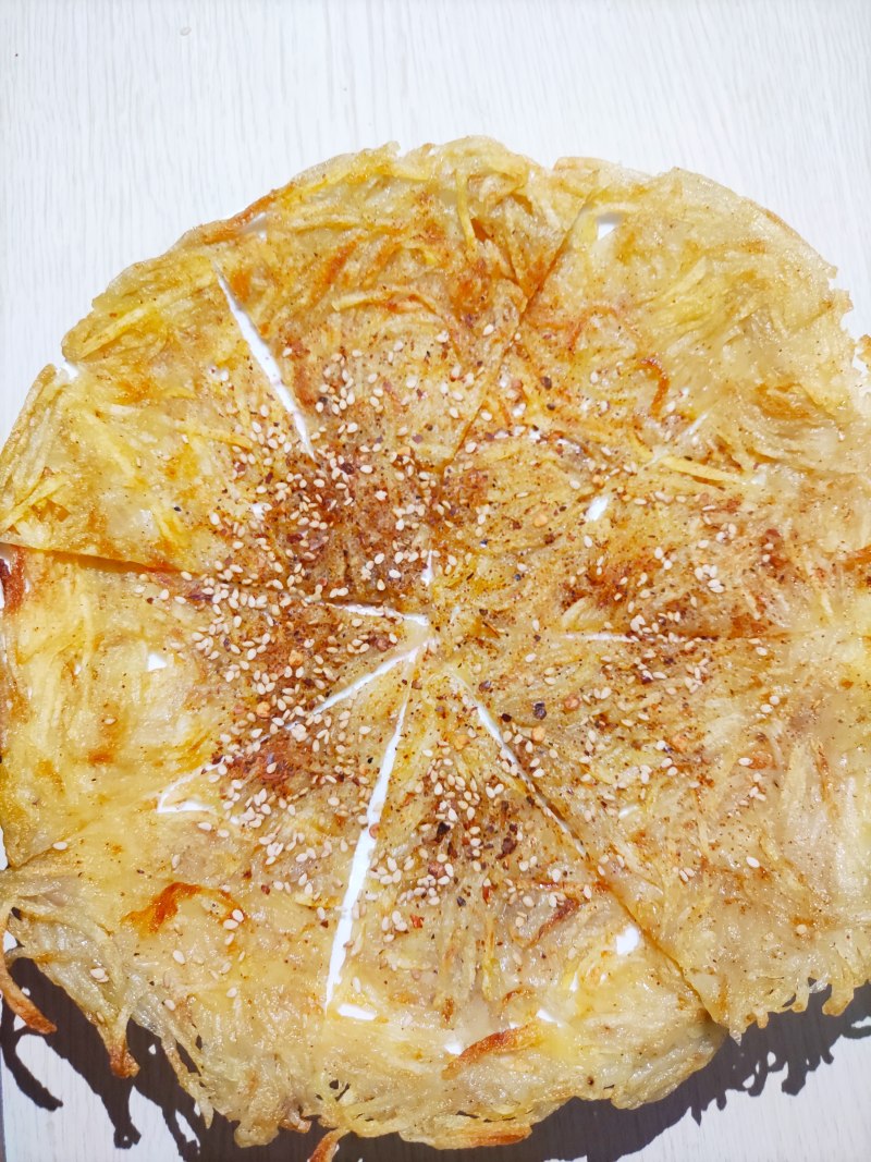 5:将土豆丝饼切成自己喜欢的形状,装入盘内,撒上熟芝麻和麻辣鲜,就可以开吃啦!