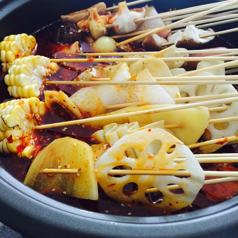 1:将金针菇洗净了,分成1朵1朵的穿成串;脆皮肠拆封串成串:年糕拆封穿成串:香菇洗净了切片串成串:土豆洗净去皮切片穿成串:千叶豆腐拆封切片穿成串:豆皮泡软后切片穿成串:生菜洗净之后分片穿成串。