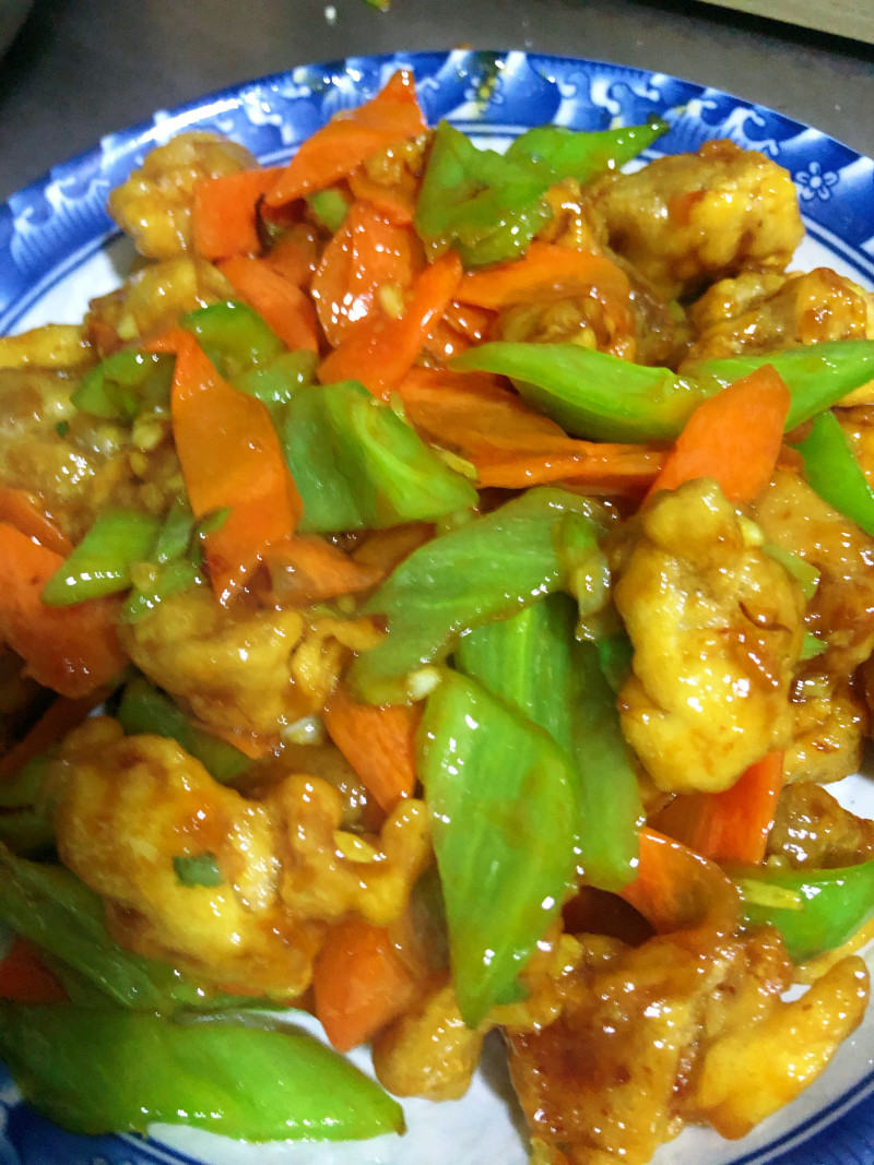 6:料酒一勺、白糖一勺、盐一勺、鸡精半勺、蚝油一勺、酱油三勺、淀粉一勺,加少许水,还有之前倒出的淀粉水一起搅拌调汁,葱姜蒜末爆香,胡萝卜翻炒一下,肉段青椒一起倒入锅内,加入调好的汁,翻炒收汁装盘即可,美美的享用吧。