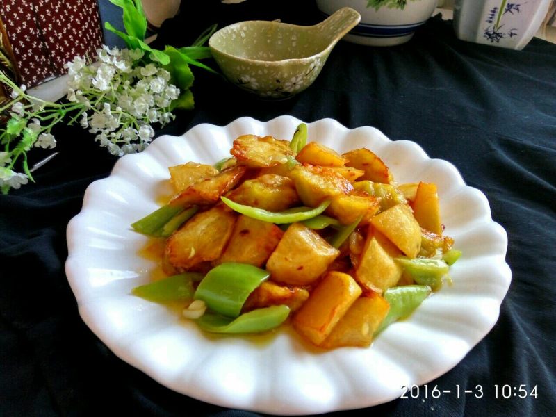 12:锅内放少许热油,放入葱蒜末煸香,加入少许清水,倒入适量酱油、精盐、少许白糖提鲜,加水淀粉烧至浓稠后,放入炸好的土豆、茄子和青红椒块,大火翻炒几下,加入少许鸡精即可出锅