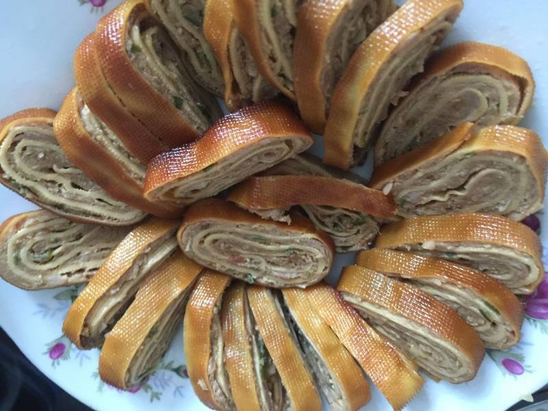 3:豆腐皮或者千张也可,铺平摸好肉馅