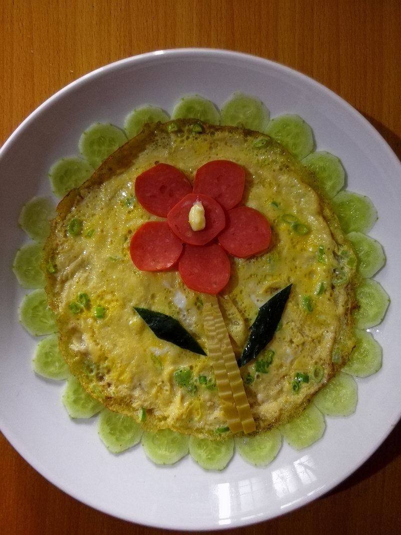 7:火腿肠切片,摆成五瓣花,中间放一片,做花心,花心上放一粒玉米,做花蕊