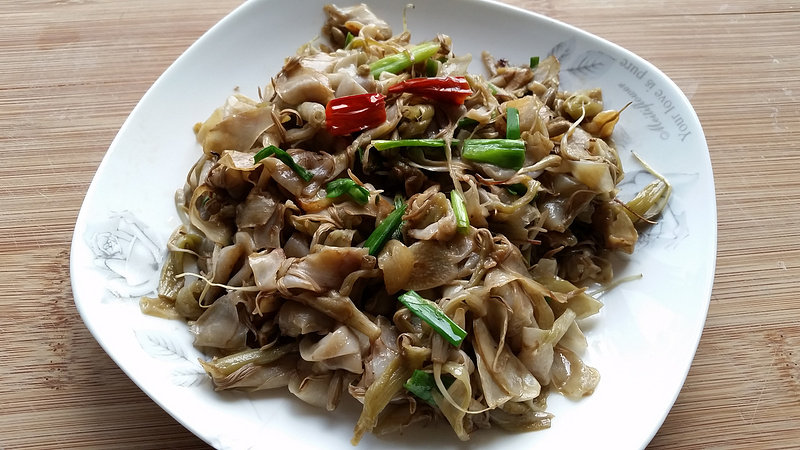 4:放入栀子花,加入适量辣椒和葱,加盐、料酒、鸡精翻炒。