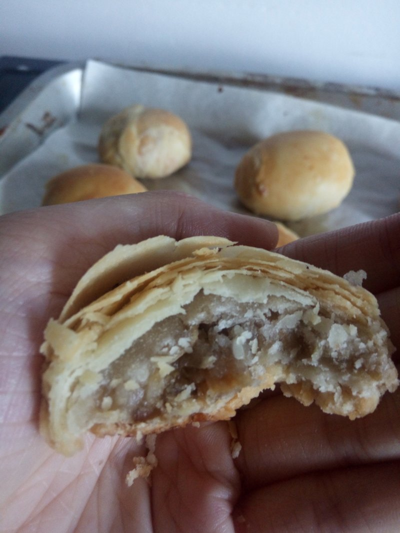 6:皮弄好了把馅包好,烤箱预热180度,二十分钟,烤到上色,就好了