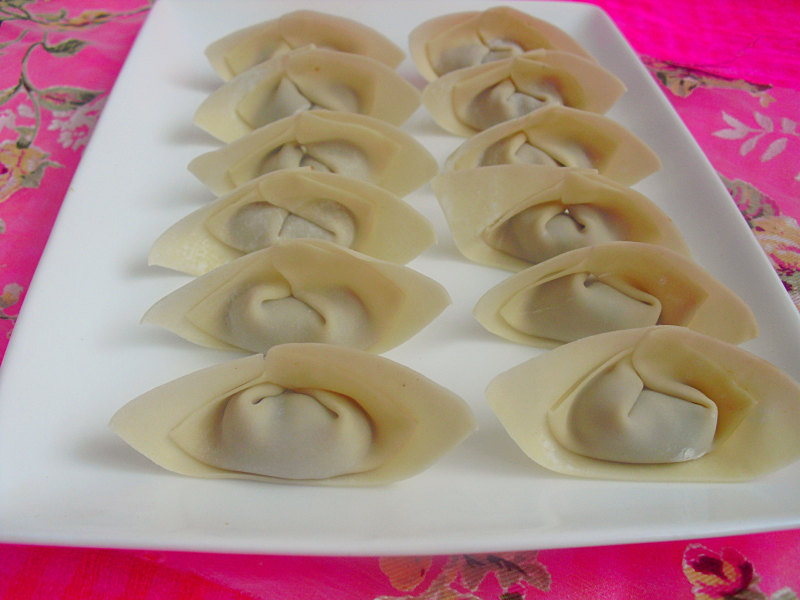 4:左右边角对折形成扇形包好一个馄饨