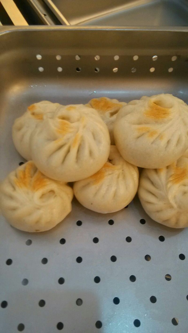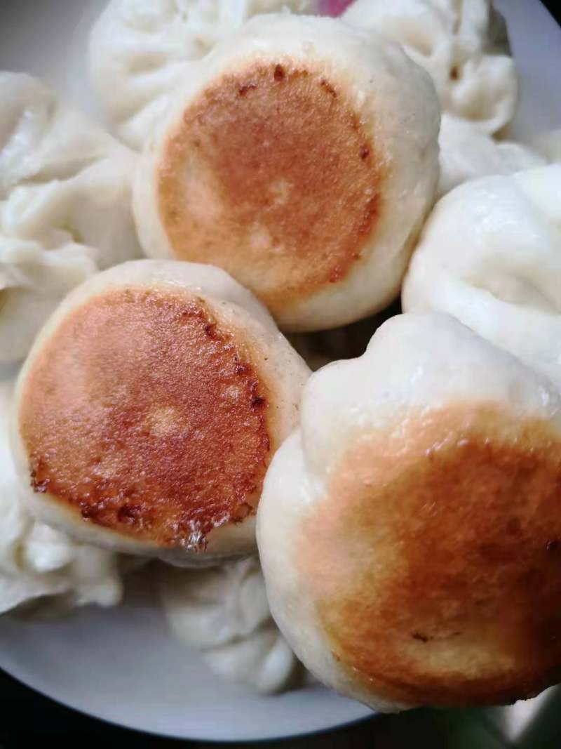3:小包子发平底锅慢煎,包子底起壳了,调淀粉水淋上去,加盖闷8分钟左右(时间视包子大小和水的多少决定)等水闷干,就可以吃到包子软香,底部香脆的生煎包了。