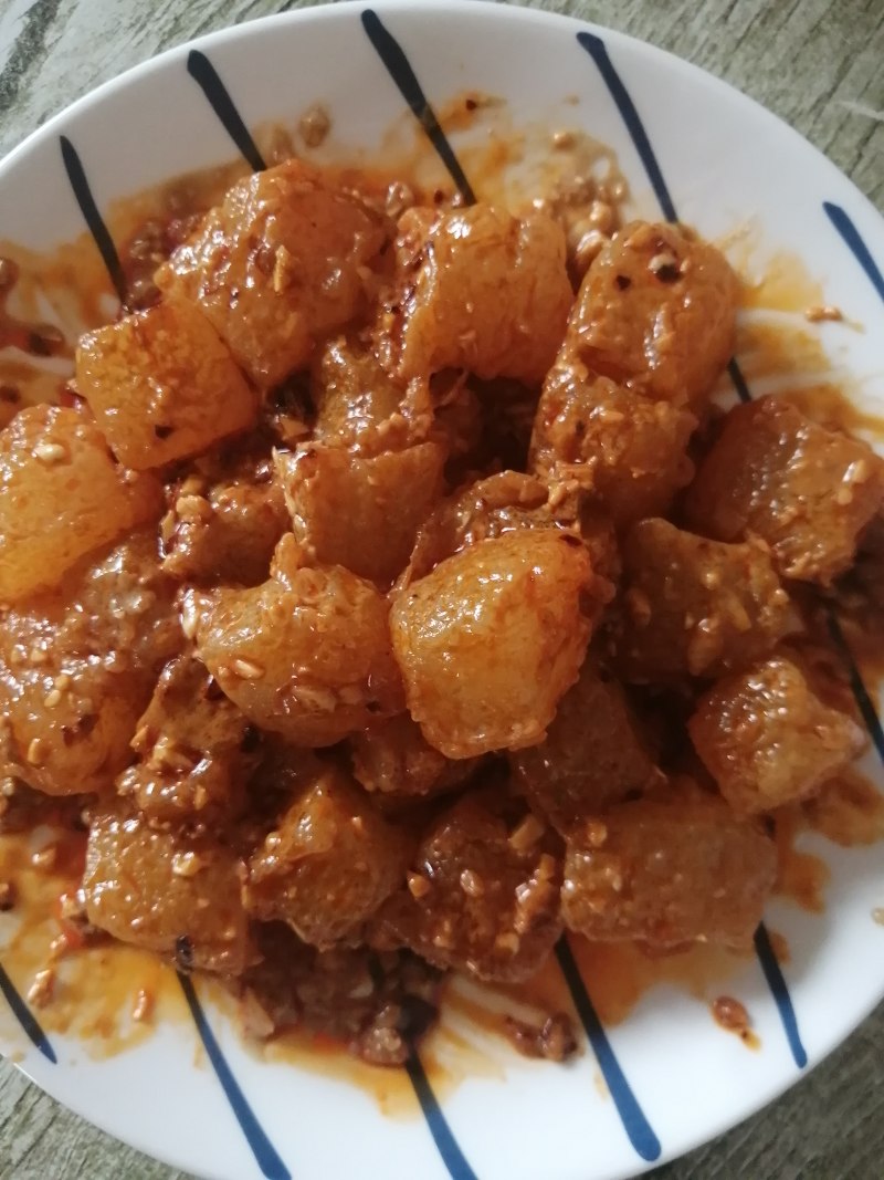 5:把搅拌好的麻酱放在焖子上,放上辣椒油。