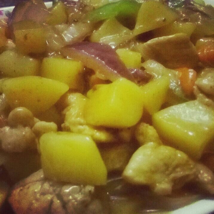 6:加入鸡肉翻炒两分钟,倒入土豆翻炒,撒入适量的盐加入咖喱