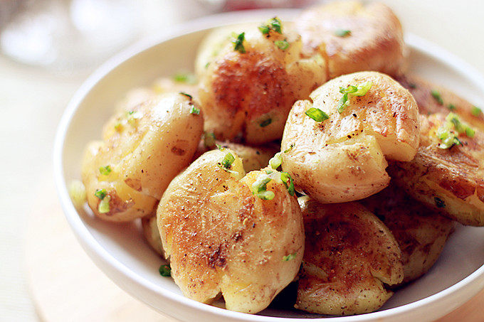 Tips:1.小土豆不去皮的话,煎出来表皮会焦焦的,很好吃哦;2.土豆不要煮太烂,拍扁的时候也不要太用力,轻轻压扁即可;3.调料看自己喜欢,爱吃辣的,加些干辣椒,味道也超棒;4.出锅后趁热吃最好吃啦~
