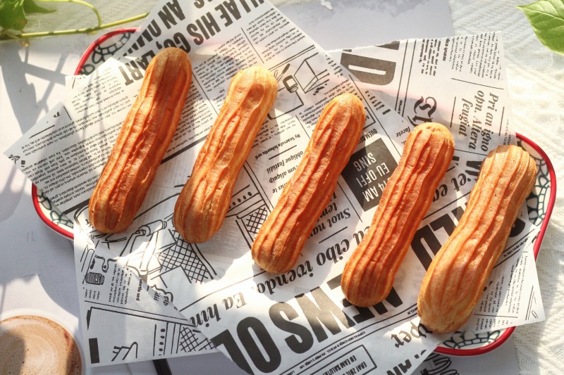 9:在铺有油纸的烤盘中挤出长条状,长度和中指相当即可