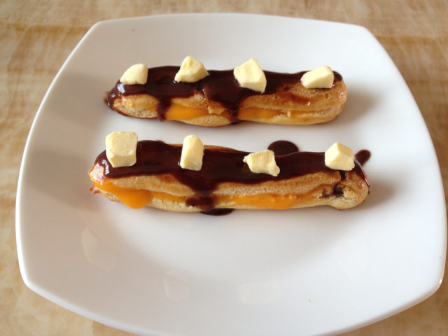 9:中间割开,挤入打发好的奶油,表面刷上巧克力炼奶或果酱,放几块法国黄油点缀就好了
