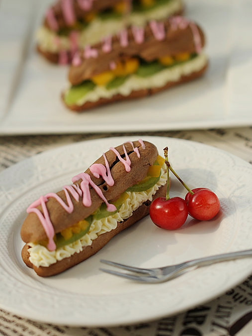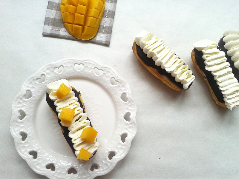 16:芒果切小丁,摆到泡芙上,再取巧克力豆,摆到奶油上