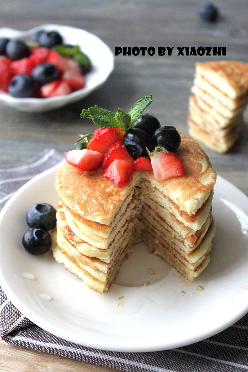 11:将煎好的松饼摞在一起,装饰新鲜水果,洒上些蜂蜜即可食用