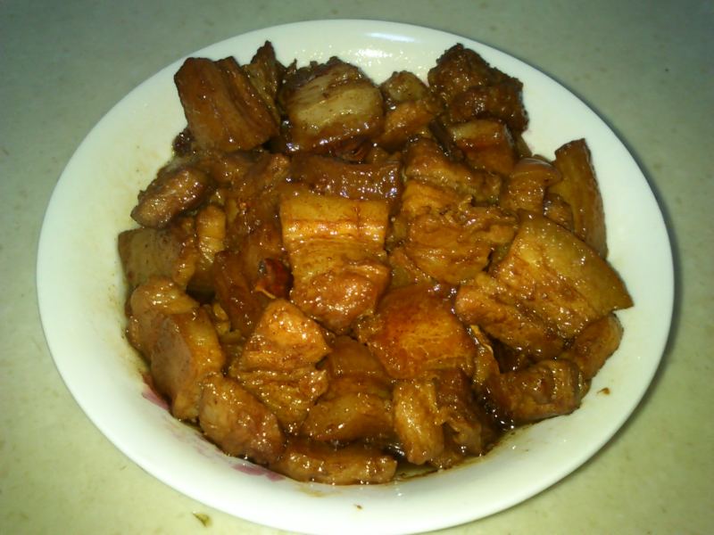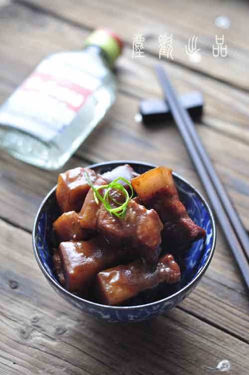 3:五花肉1000克洗净切块冷水下锅焯水撇去浮沫捞出控干水分备用,姜切片,八角两个,冰糖100克!