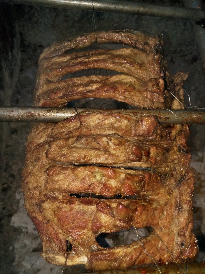 1:将排骨,鸡改刀,腌制,上炭火烤。