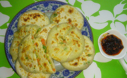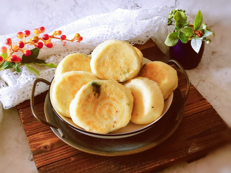 用饼铛煎至定型后用锅盖盖一会儿,这样做出来的馅饼更软。