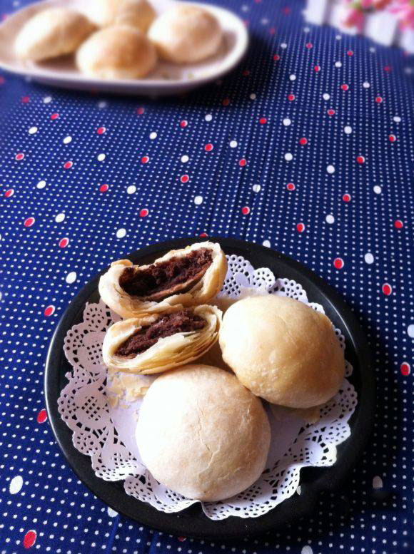 9:再擀成圆饼状,放入豆沙馅(馅料有点散)