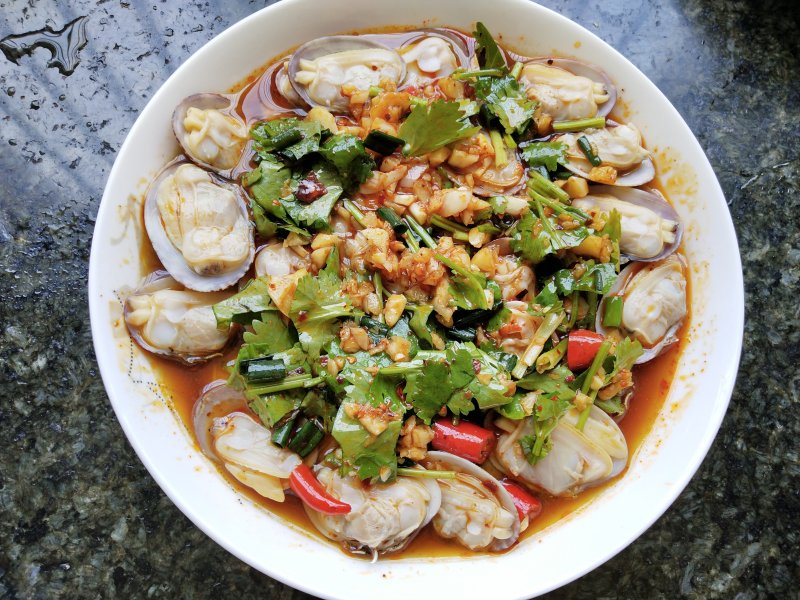 11:把调好的捞汁均匀的浇在花甲上,浸泡半小时吃会更入味。