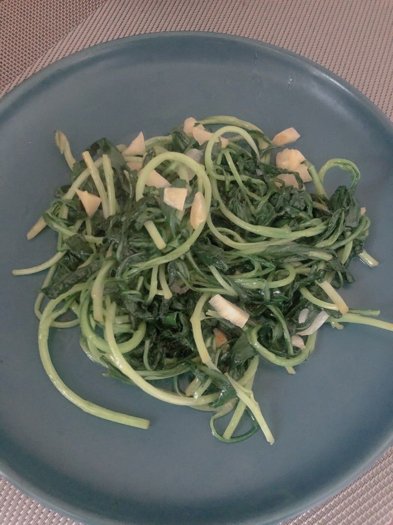 6:把芥兰倒到锅里一起翻炒片刻,然后放糖和盐翻炒均匀即可上盘。
