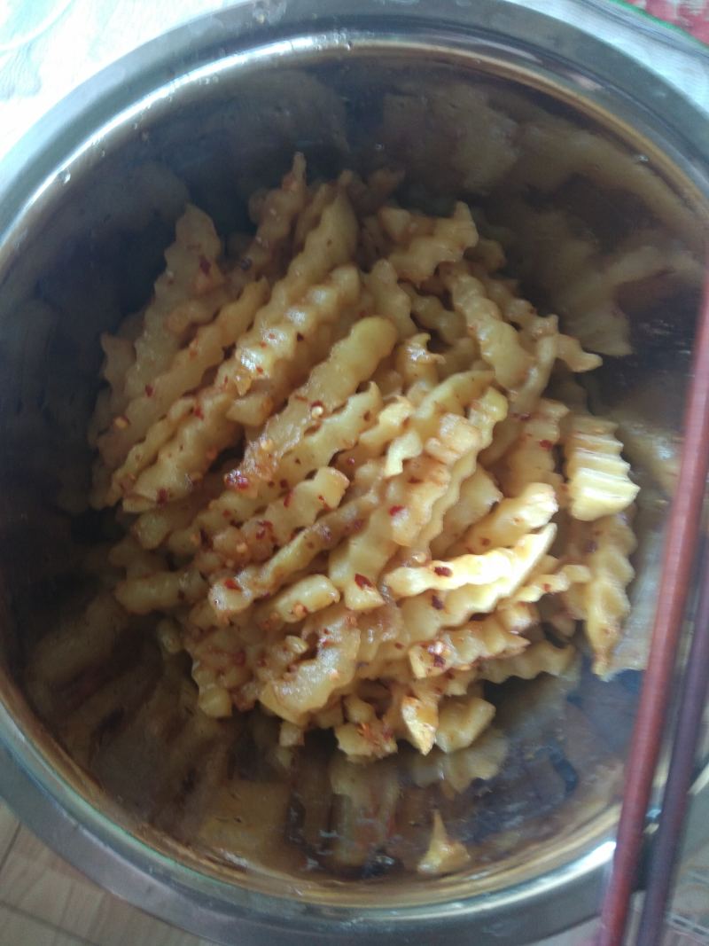 6:捞出的土豆放入一勺盐、一勺鸡精、一勺味精、一勺白糖,35克醋,35克辣椒油,搅拌即可食用。