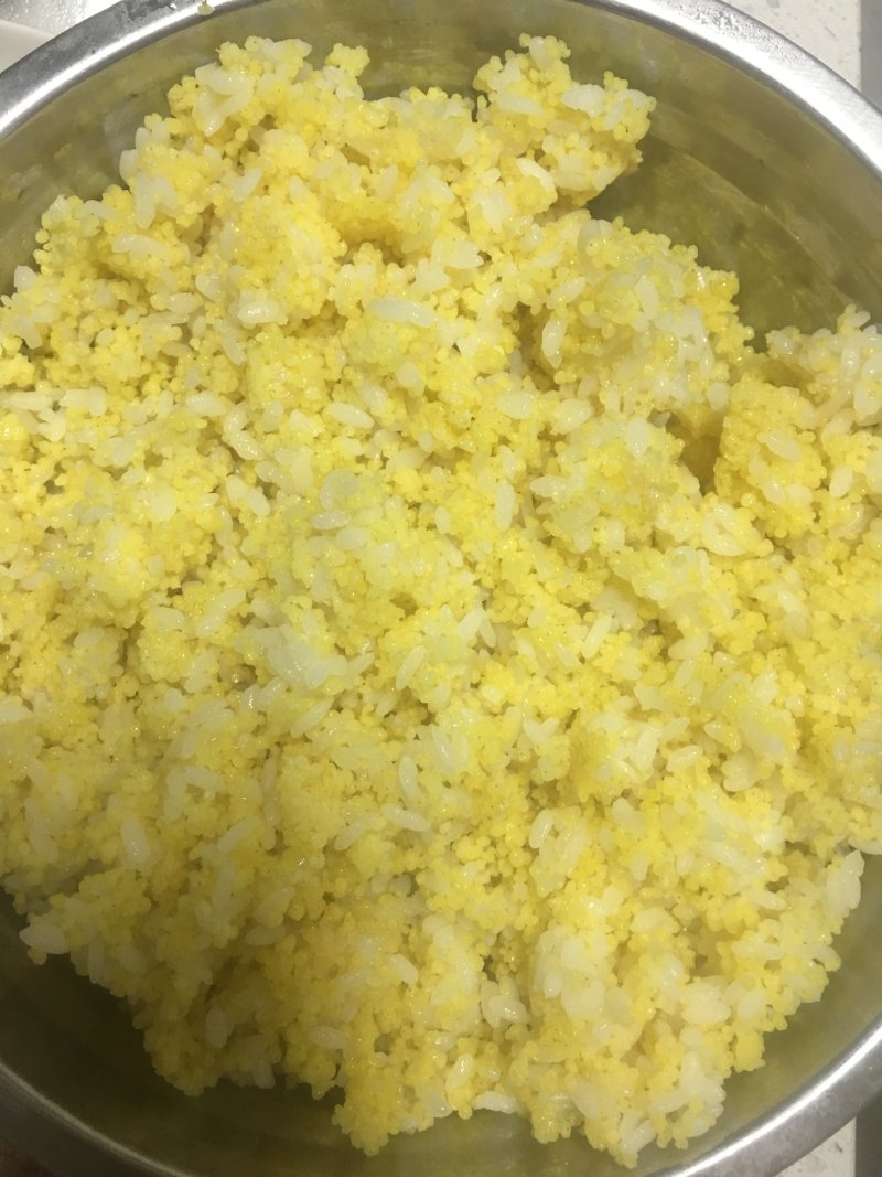 13:取出蒸透的双色糯米饭,淋入橘子汁、撒入玫瑰花酱点缀增香,口感软糯、香气宜人。