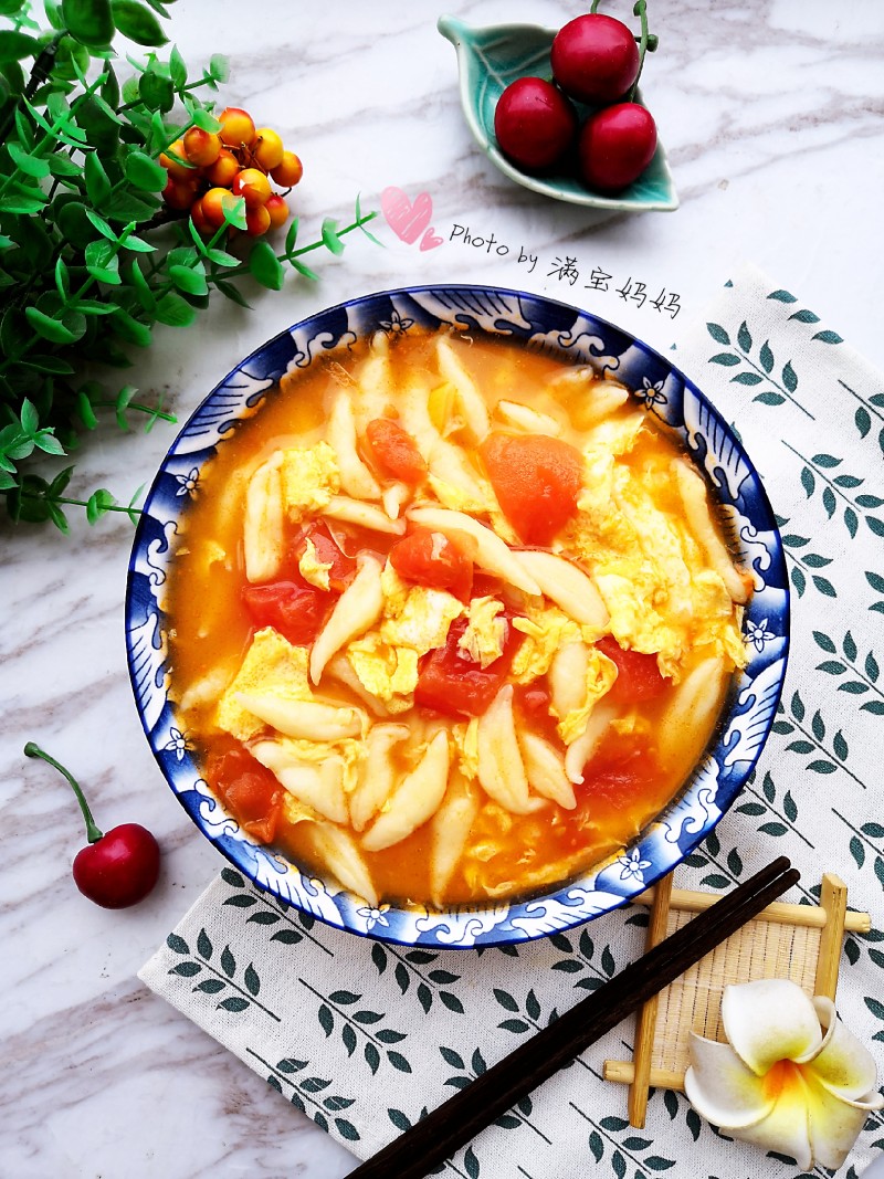 3:锅里放番茄炒至粘稠,加入开水,用剪刀剪面团,煮至6-7分钟。