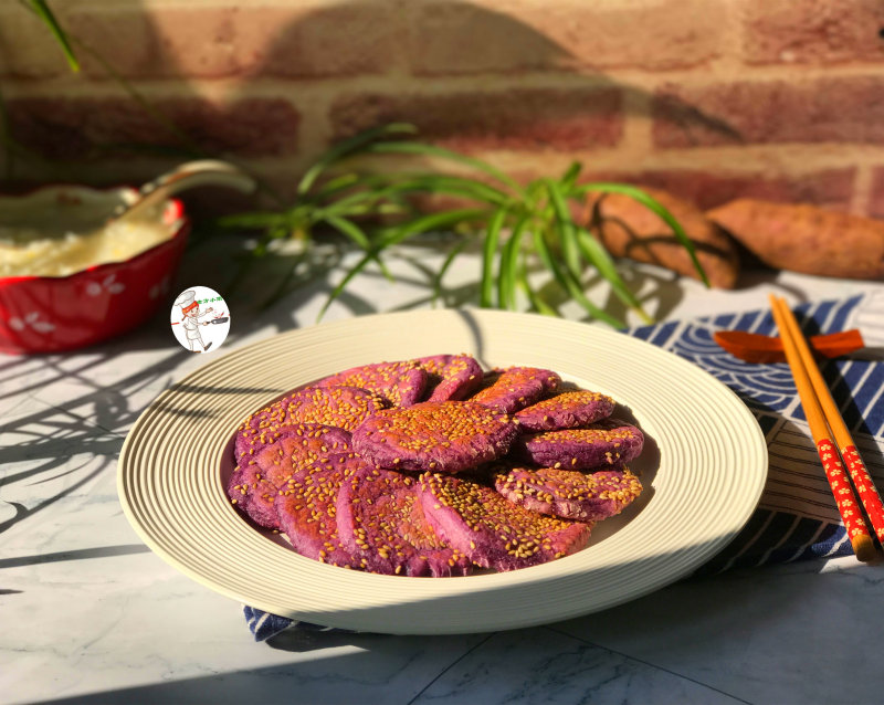 11:出锅装盘,紫薯饼比较薄,加上电饼铛又是双面烙的,所以是很好熟透的。