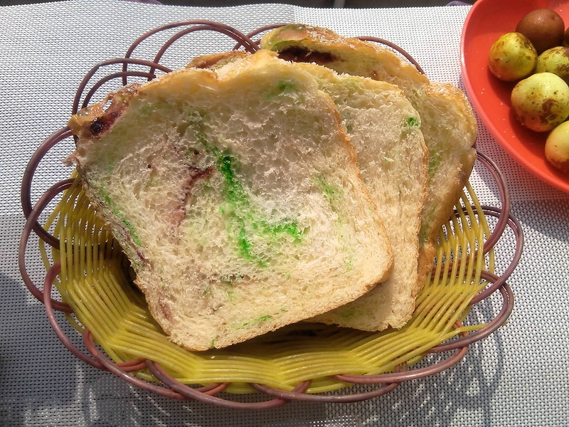 蓝莓果酱适量;斑斓香精2滴;椰蓉适量;黄油20G;酵母3G;盐2G;白糖30G;