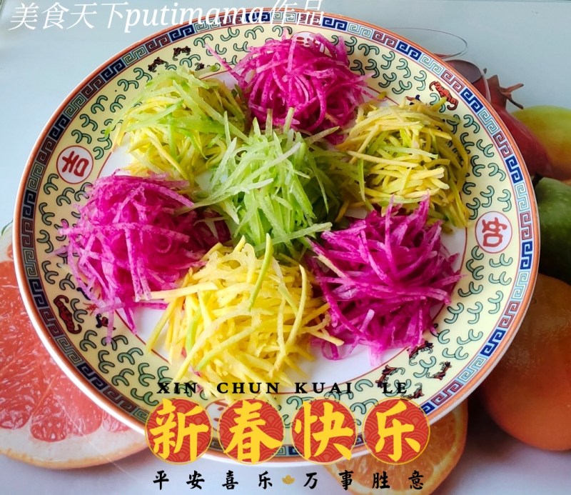 3:将3种食材分别擦成丝,找个大盘子将3种不同颜色的萝卜丝分别摆放盘中,颜色非常艳丽漂亮,五彩缤纷。
