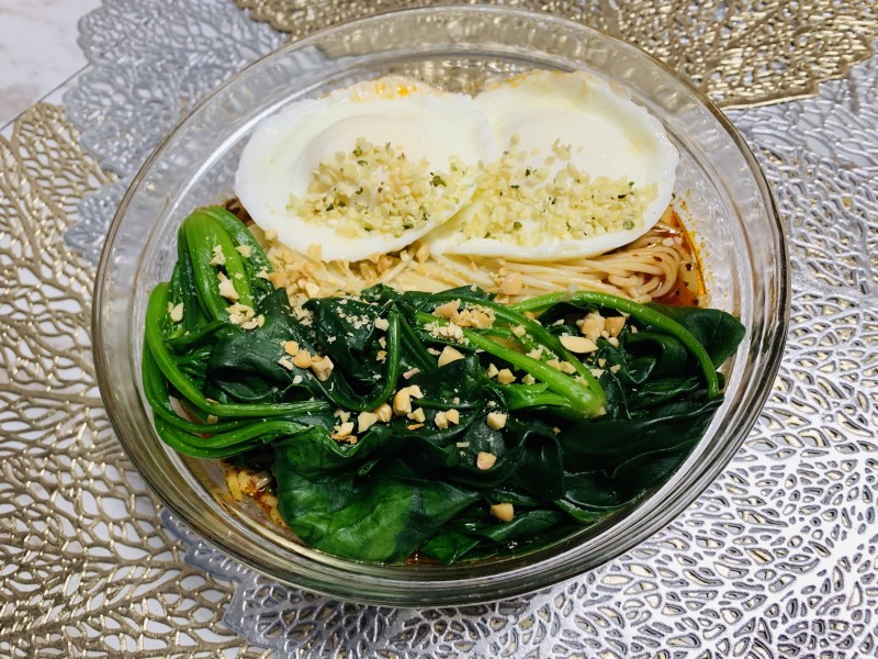 10:将煮熟的菠菜和鸡蛋码放在面上。