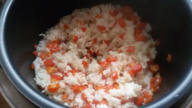 5:提示做好,等我们午饭时,打开锅盖,用锅铲把胡萝卜和饭搅拌混合均匀就可以了