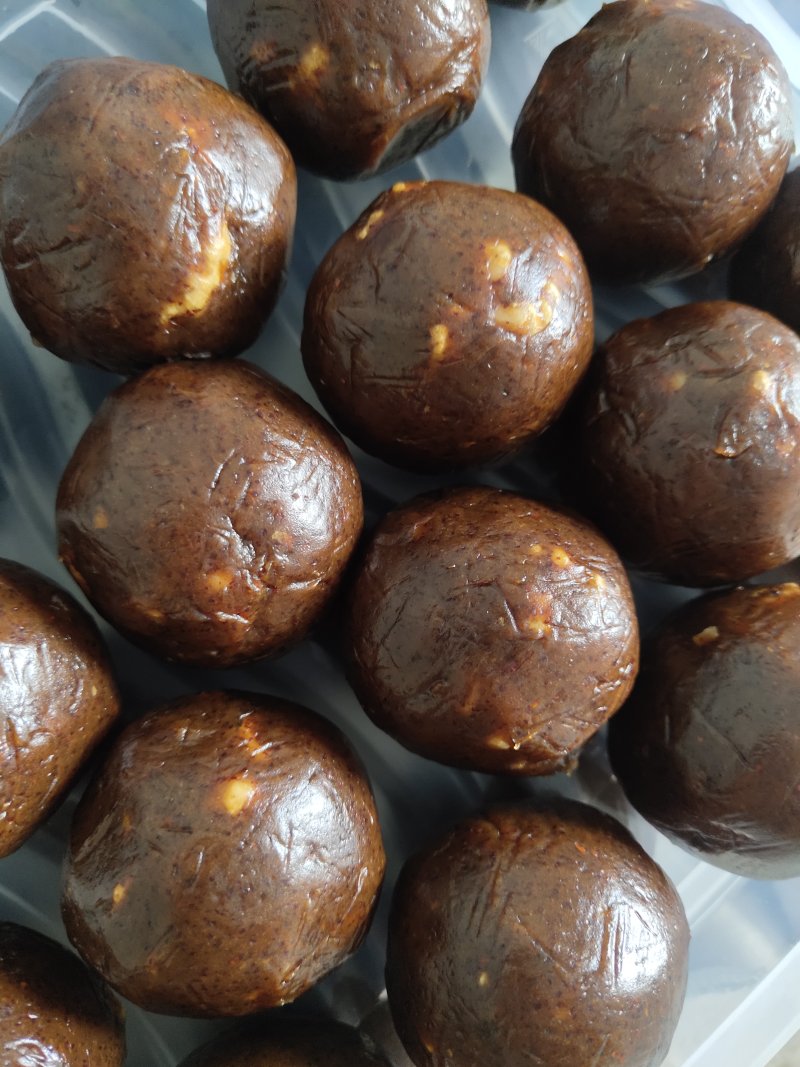 3:中途加入适量的白糖或者红糖、核桃碎、和少许玉米油,炒至枣泥抱团,就可以盛出来放凉。