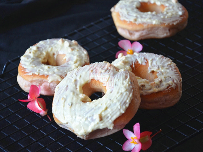 15:用硅胶刷将融化的白巧克力刷在甜甜圈上就行了。