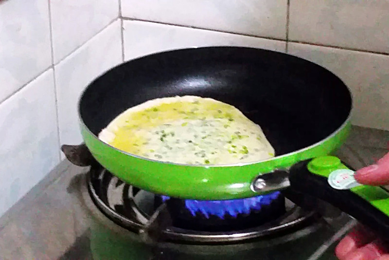 5:平底锅中放少许油,中火,正反面煎至表面有点黄就好。ps.在煎的时候,你就可以去弄第二块了,中途记得来翻个面,第二块饼弄好这块饼也煎好了。不耽误时间~
