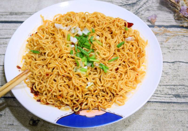 7:煮好后捞出干面条,倒入生抽、老抽和一勺炸好的葱油,拌匀即可。