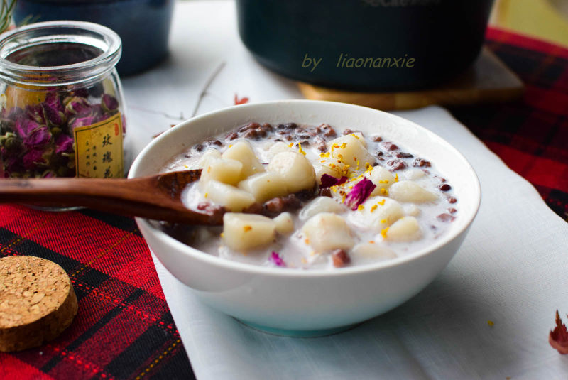 11:把牛奶和芋圆下锅,同红豆沙一起煮开,装入碗中,就可以上桌了,可以放一点儿玫瑰花和干桂花,好看又好吃。