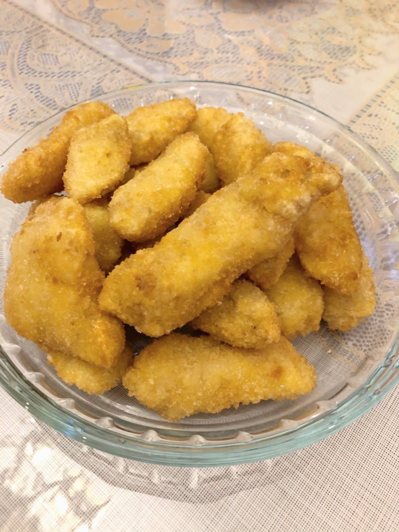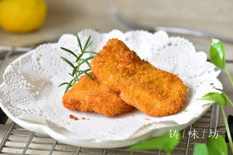 4:将油入锅中烧七成热,裹好面包糠的鱼柳放入油锅中,中火炸至金黄,既可捞出。